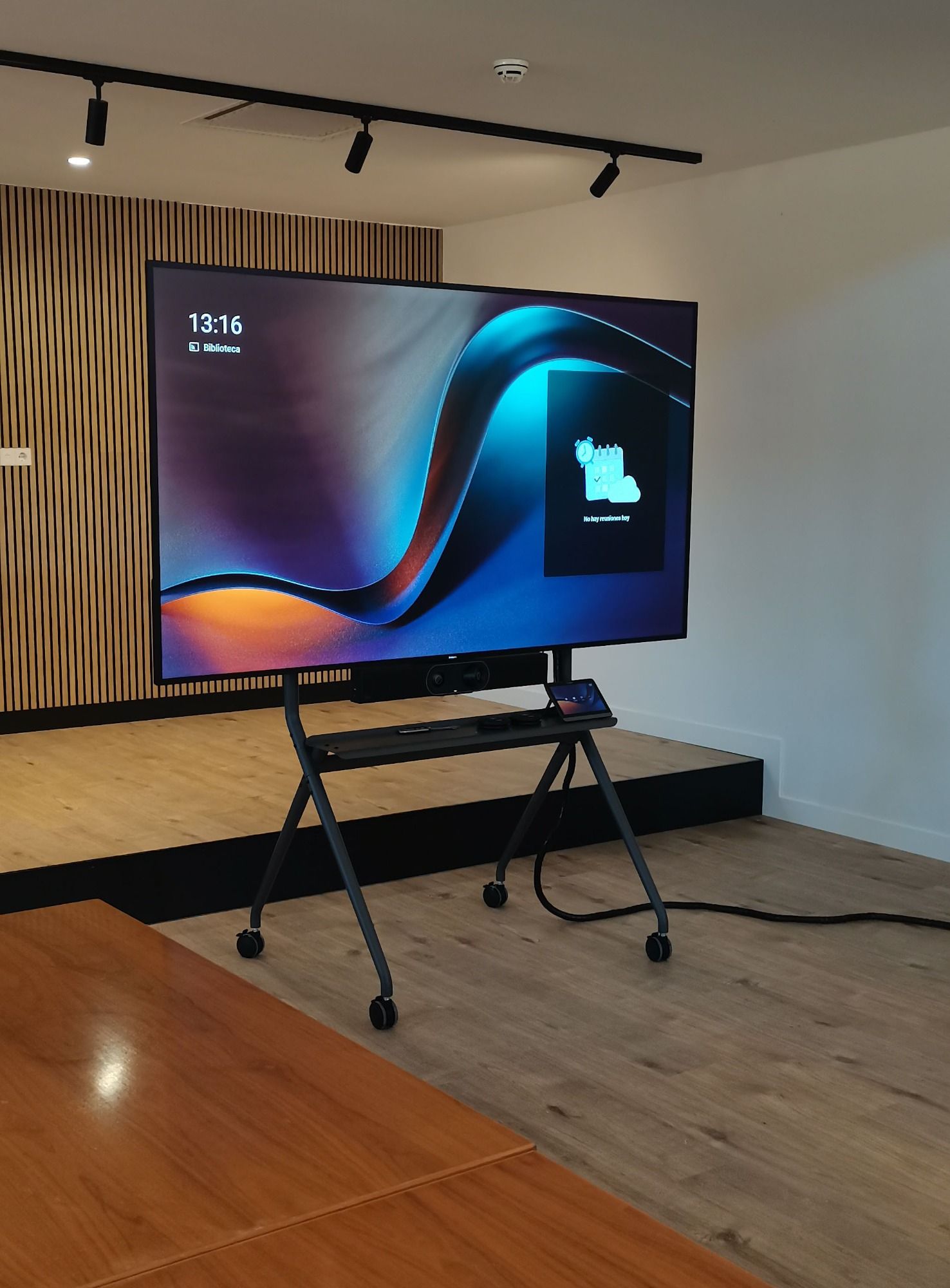 Monitor Philips de 98", cámara de videoconferencia Laia t-Pod Air Pro Quad, Barco Clickshare y sistema de micrófonos de techo.