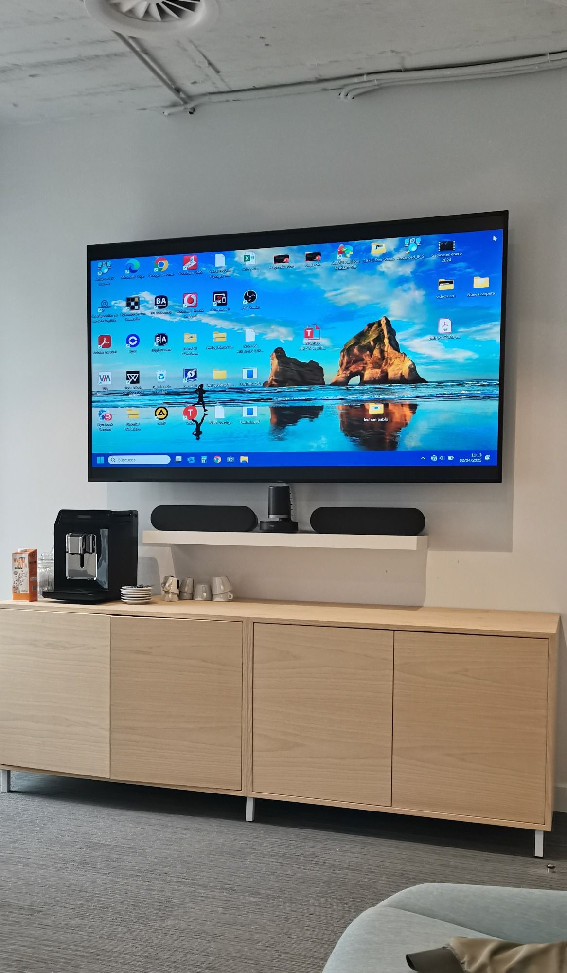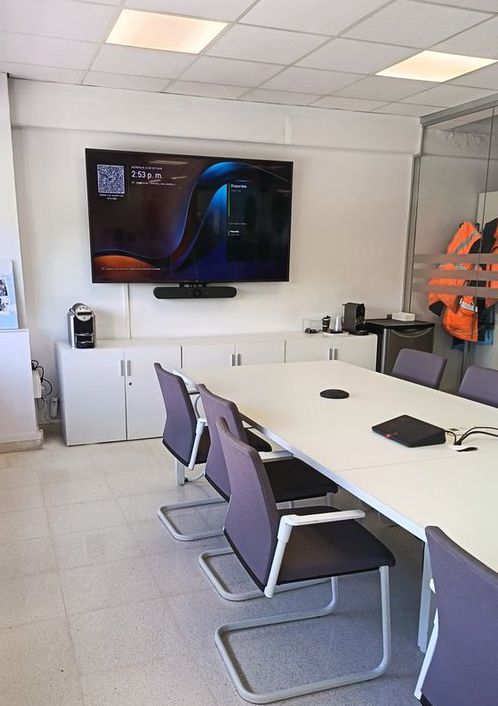 Monitor Philips de 98" y sistema de conferencia Logitech Rally. Incorpora un sistema de sonido en la sala con altavoces de techo Xilica.